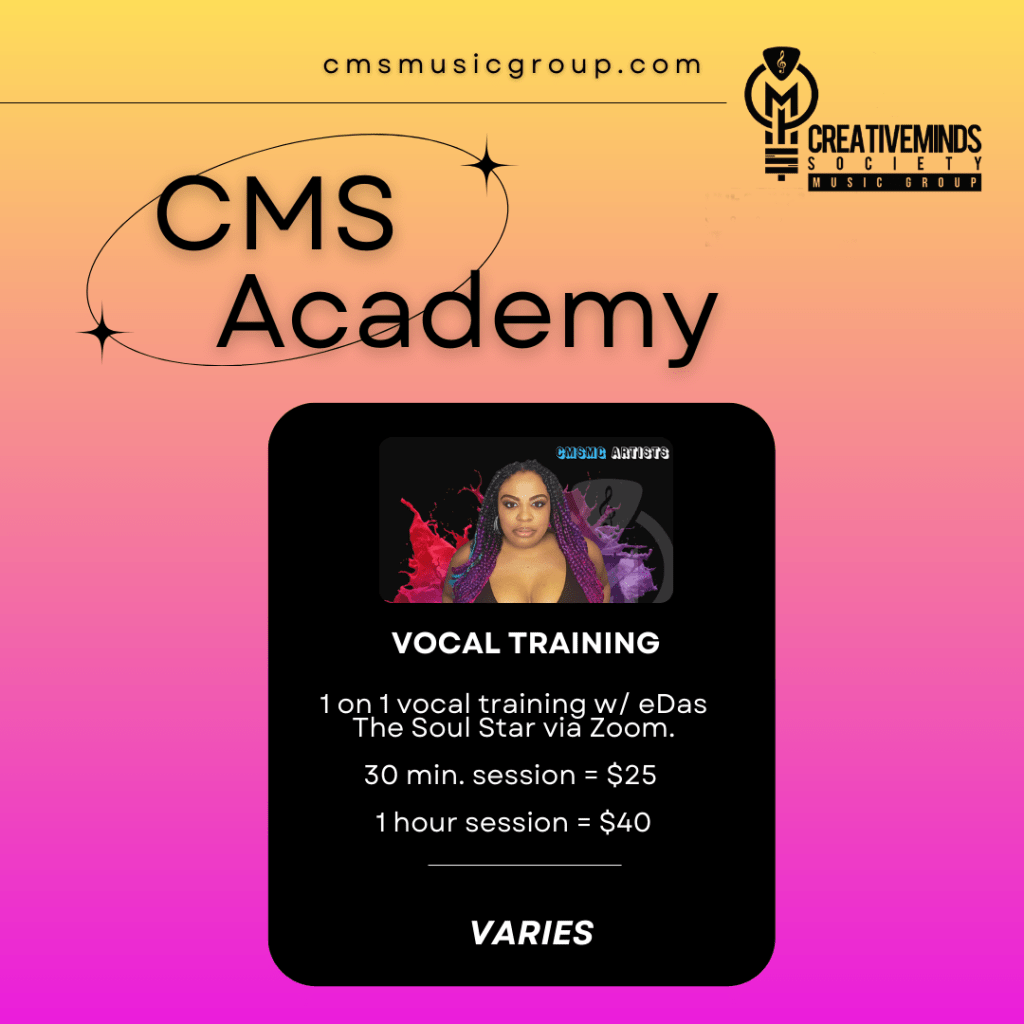 The idea behind the CMS Creative Academy is that it will help us to achieve our mission of helping creatives to find their niche in the entertainment industry. How? By cultivating the talents of the truly gifted and determined creatives that cross our path. The Academy will be an informal art school offering voice lessons, songwriting tips, and music business 101. More information coming soon, so stay tuned!