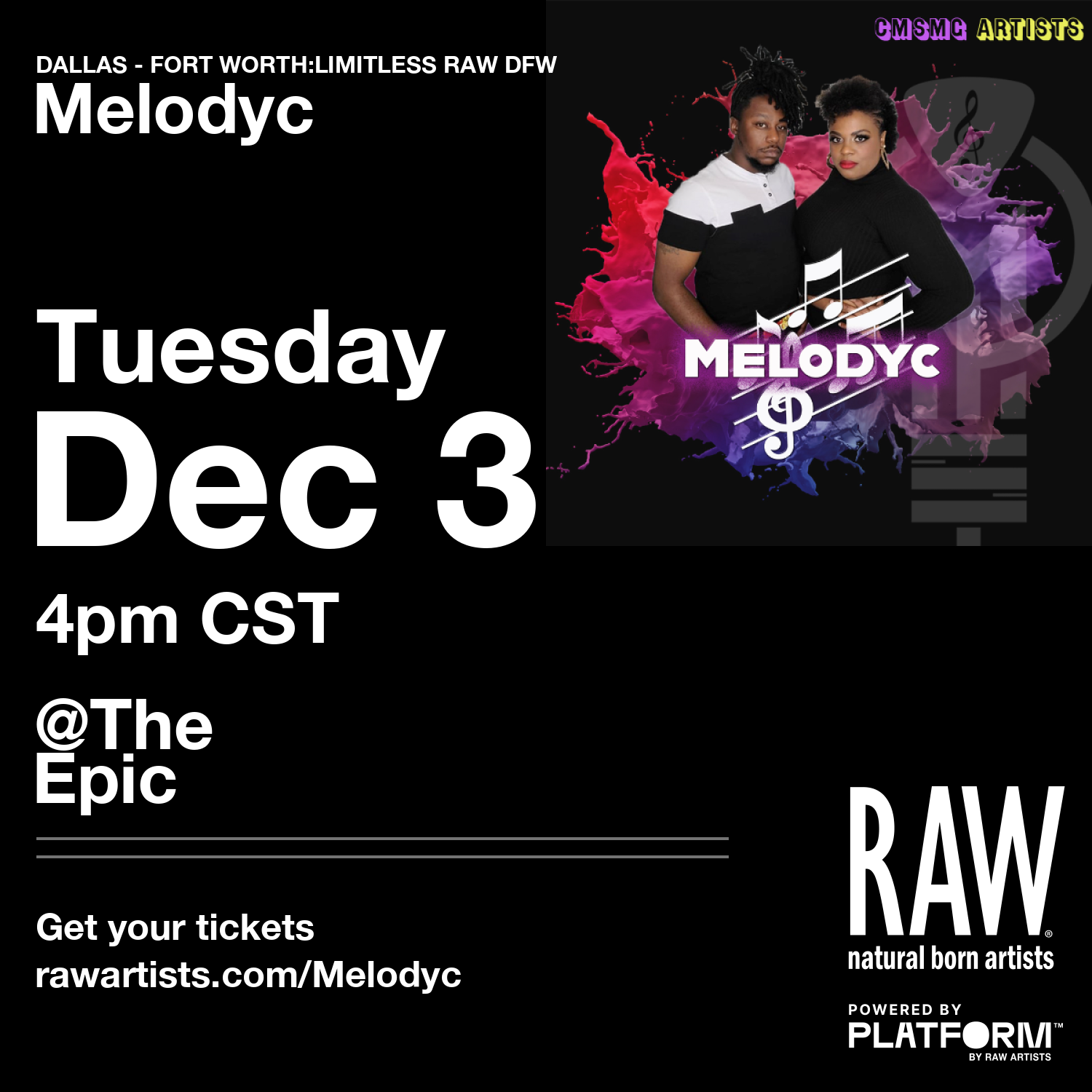 RAW is RETURNING to DFW on Tuesday, December 3rd, and CMSMG is excited to be an official sponsor of this AMAZING event! This showcase will highlight a remarkable selection of local creatives, including our own Melodyc, representing visual arts, music, fashion, film, and more! As an official RAW DFW performer, Melodyc is tasked with selling a specific number of tickets for the event. We kindly ask that you contribute whatever you can today. If you’d like to help us reach our goal, simply purchase your tickets at rawartists.com or make a direct donation below.